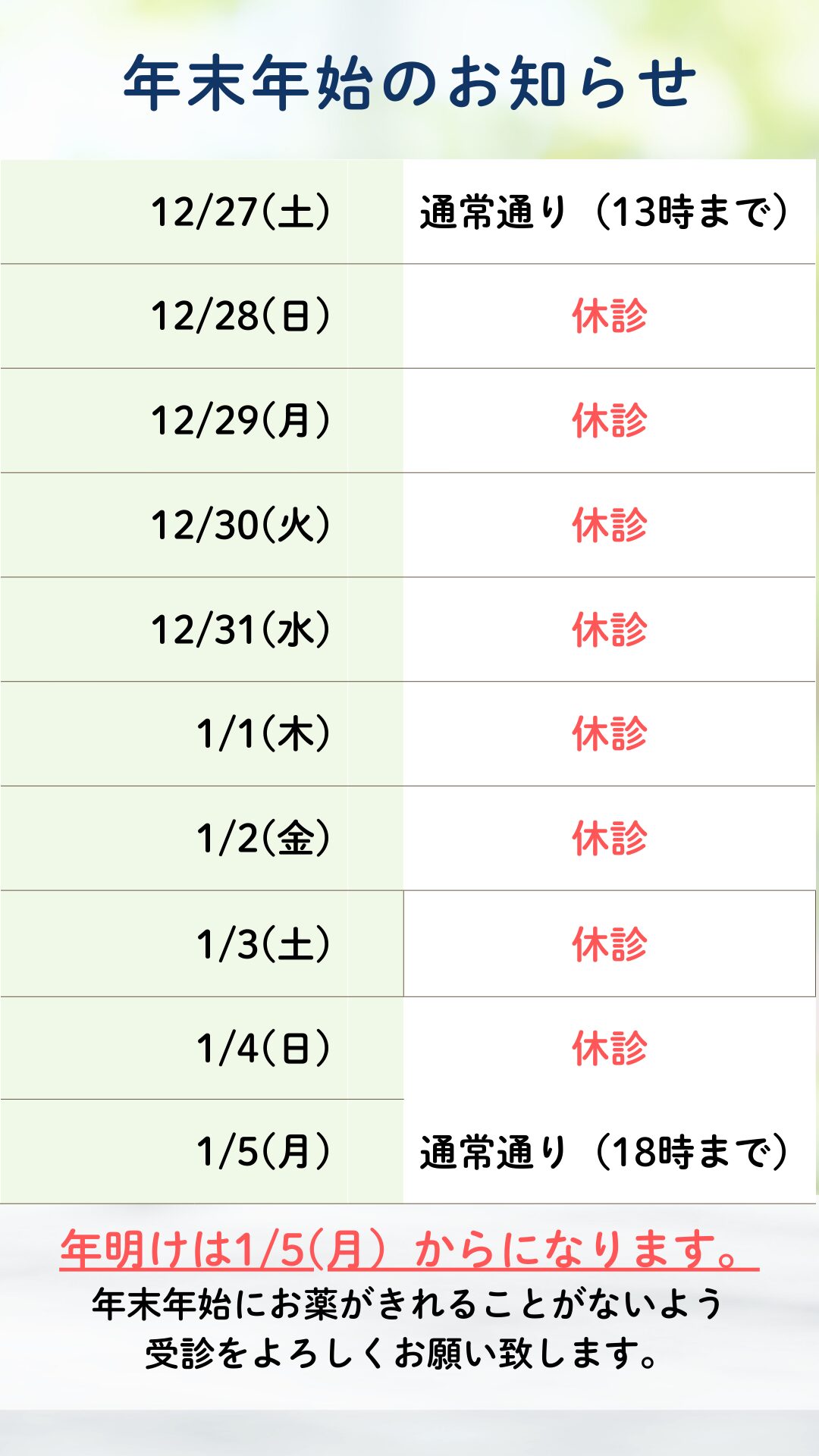 下記の期間を休診とさせていただきます。新年の診療は、1月5日(月)より通常通り開始いたします。寒さが厳しい時期になります。皆さま、温かく穏やかな年末年始をお過ごしください。