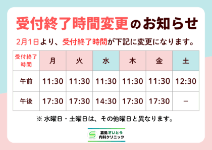 ※診察終了時間と受付終了時間は異なりますので、ご注意ください。